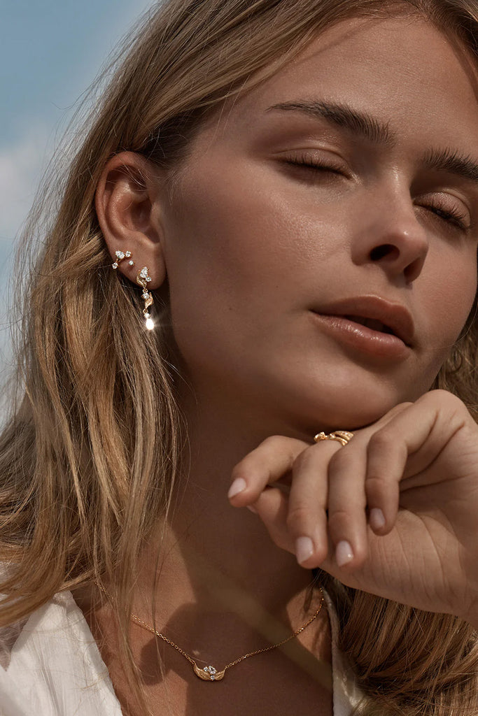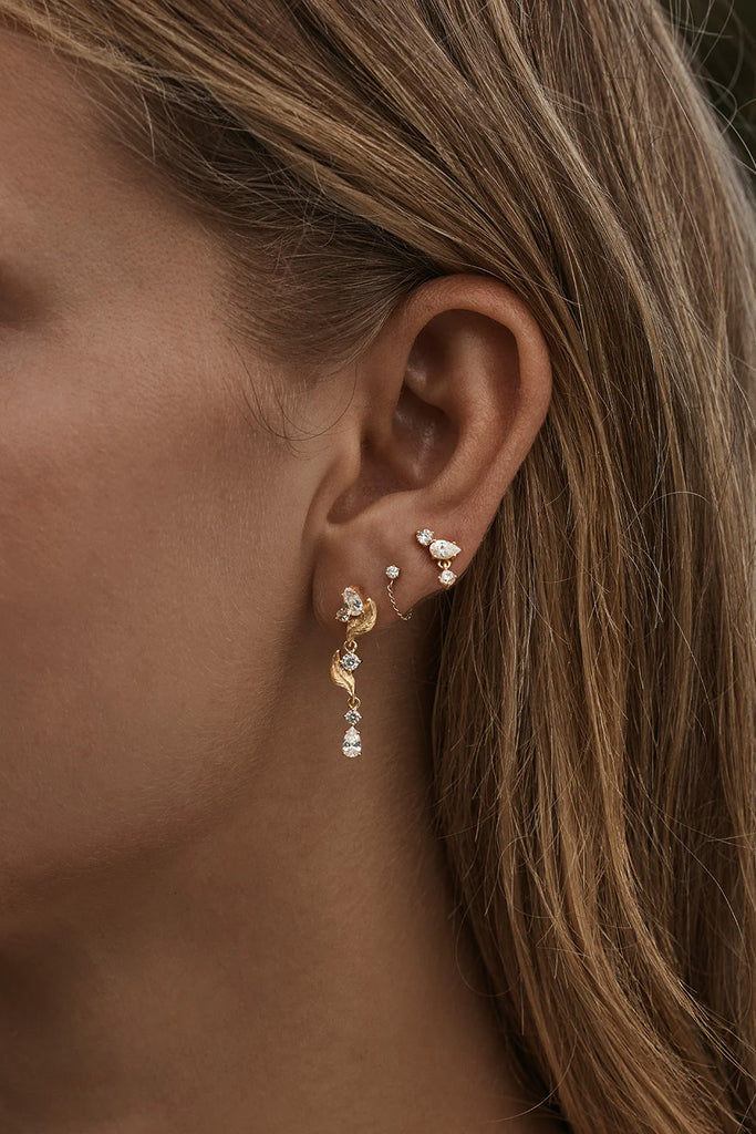 The Through The Seasons Drop Earrings are inspired by the changing seasons - a time of renewal, hope and transformation - using leaves as symbolic talismans. This design speaks to the dewdrops on leaves - elevated with sparkling crystals.