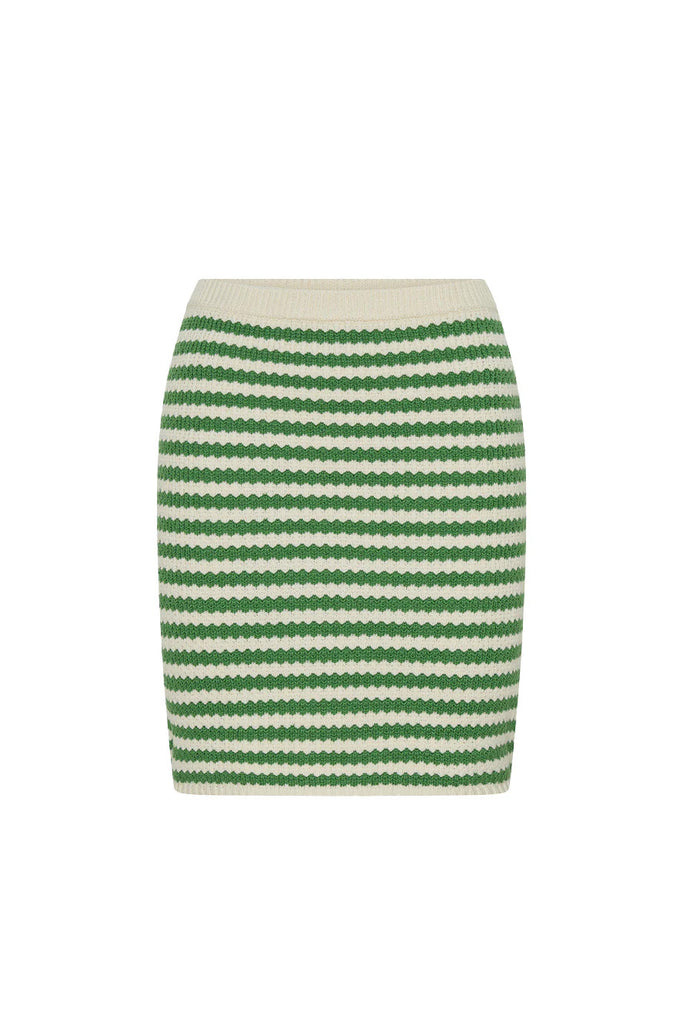 The Corinne Knit Mini Skirt is crafted in a soft green and cream stripe knit, featuring an elasticated waistband and a ribbed hem for subtle structure and comfort. Style with our Tallulah One Shoulder Tank and slides for everyday ease.