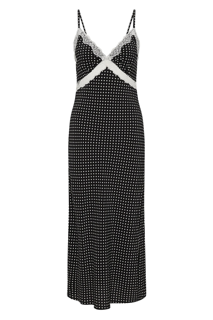 The Darlene Slip Dress in black polka with contrast cream lace is a timeless slip midi, designed with a flattering V-neckline, delicate lace inserts, and a softly gathered bust. Effortlessly feminine and ready for any event you throw at it, this dress is pure elegance.