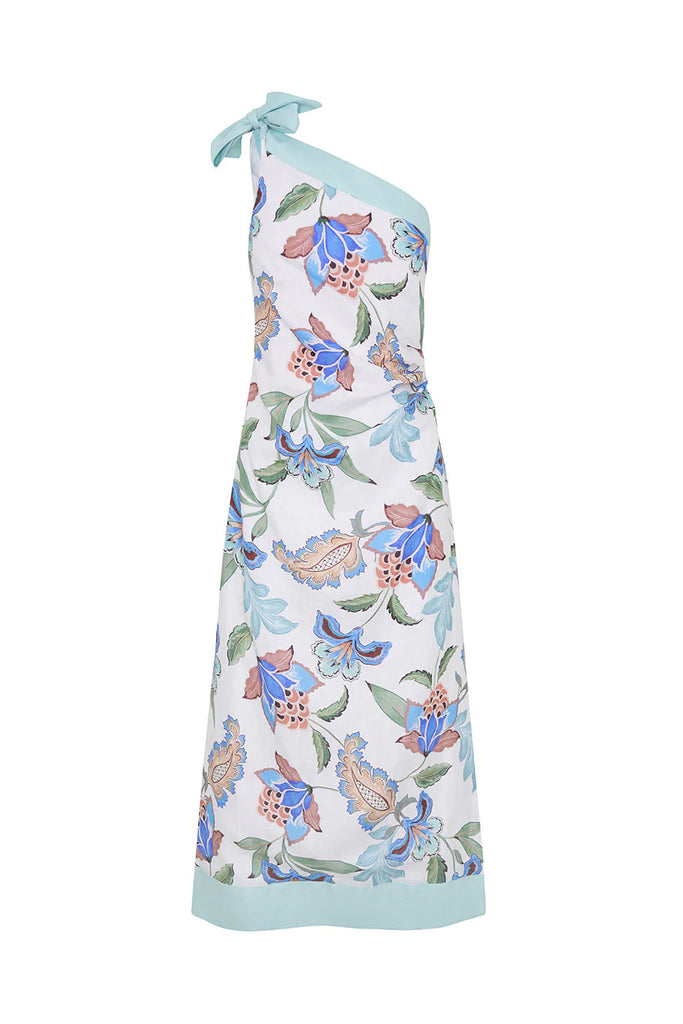 Azure is a bold floral, alive with striking blue blooms, terracotta accents and green leaves on a crisp white base. The Azure Midi Dress silhouette features an asymmetric neckline and adjustable shoulder tie, finished with contrast mint detailing along the neckline and hem. Perfect for long lunches, coastal getaways and elevated evening occasions.