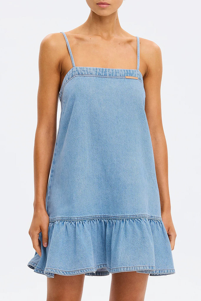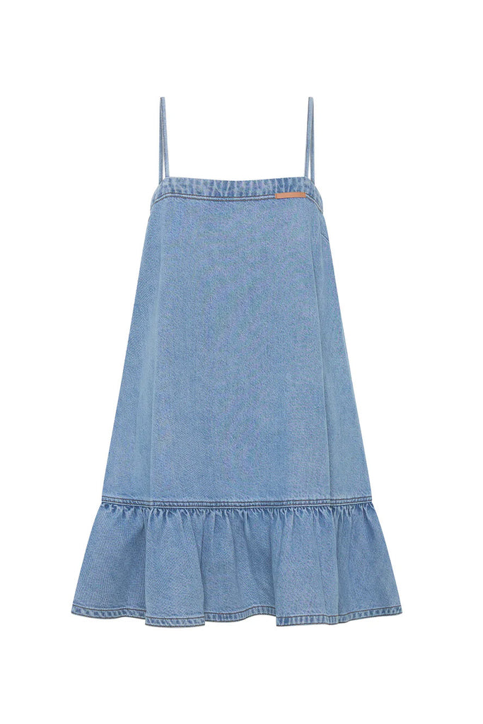 The Emilie Denim Dress features thin shoulder straps and a dropped waist that falls softly to a gathered frill hem. Light and effortless, it brings a refined approach to warm-weather dressing. Style with simple sandals for daytime ease, or elevate with heeled mules for a more elevated look.