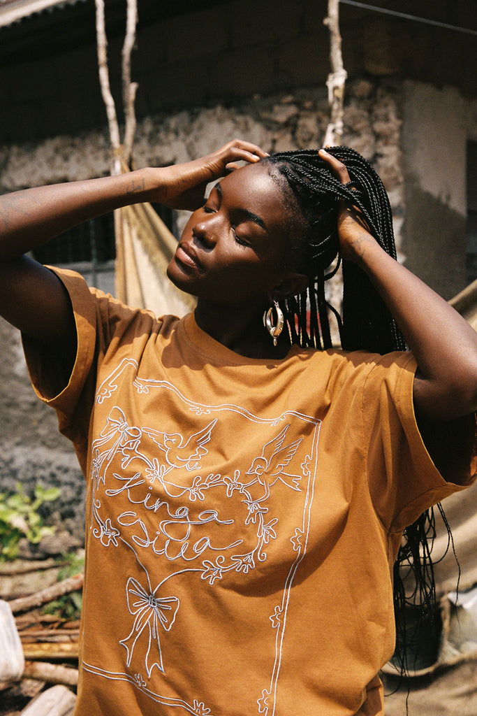 The Amante Tee is the signature KC shape with a romantic edge. Crafted from soft cotton jersey in a rich earthy brown tone, this oversized graphic t-shirt features a delicate linework illustration of doves, florals and ribbon motifs framing Kinga Csilla hand writing.