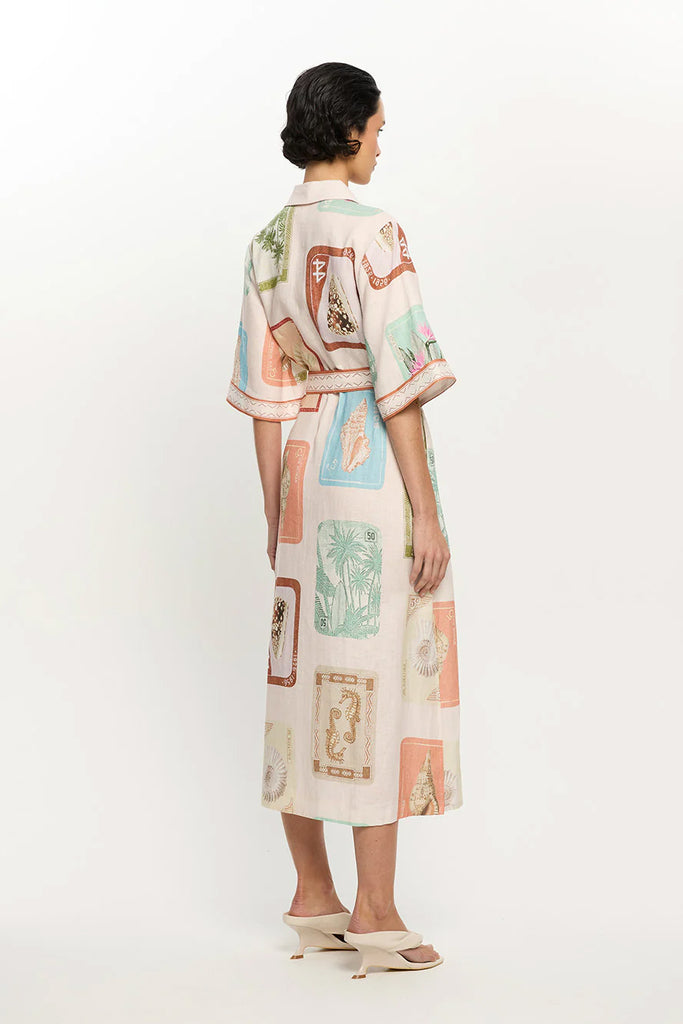 Coastline is a vintage-inspired postcard print featuring coastal motifs in soft pastel tones on a soft neutral base. The Coastline Shirt Dress is crafted in a relaxed silhouette, featuring kimono-style sleeves and a button-through front. Complete with a removable waist tie, it offers the option to wear loose for effortless ease or cinched for a more defined shape. Elevate with heels for long lunches or evening celebrations.