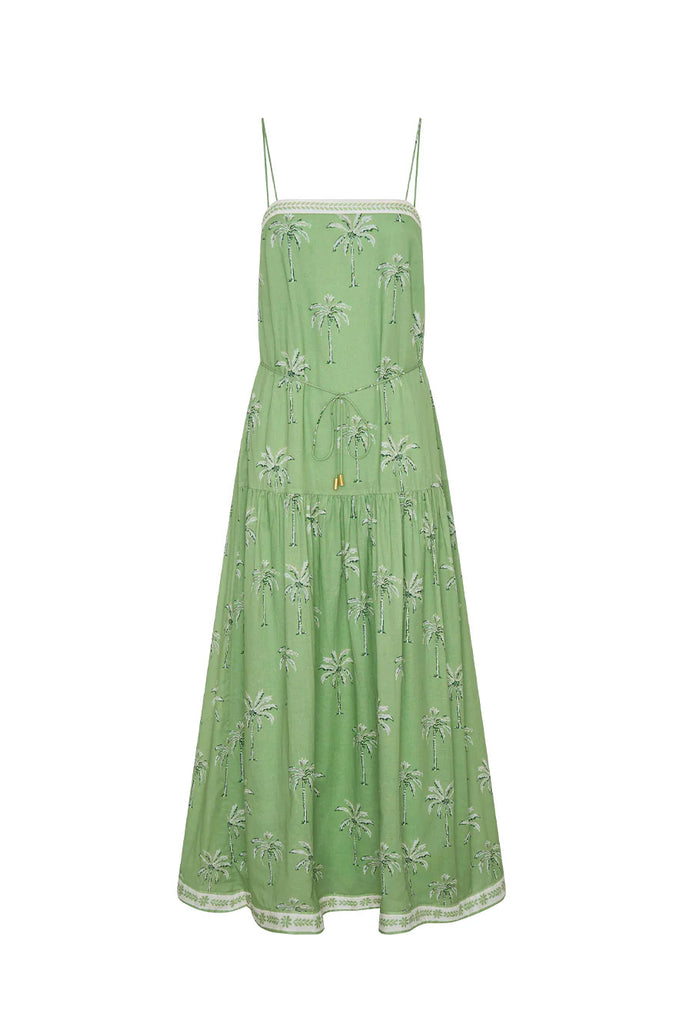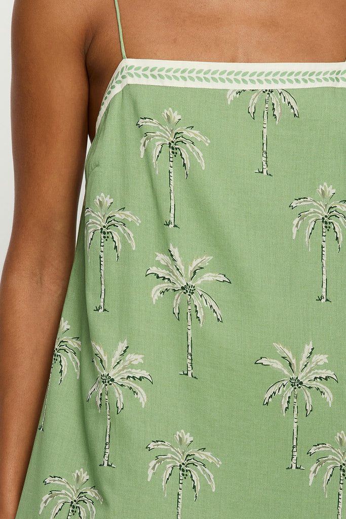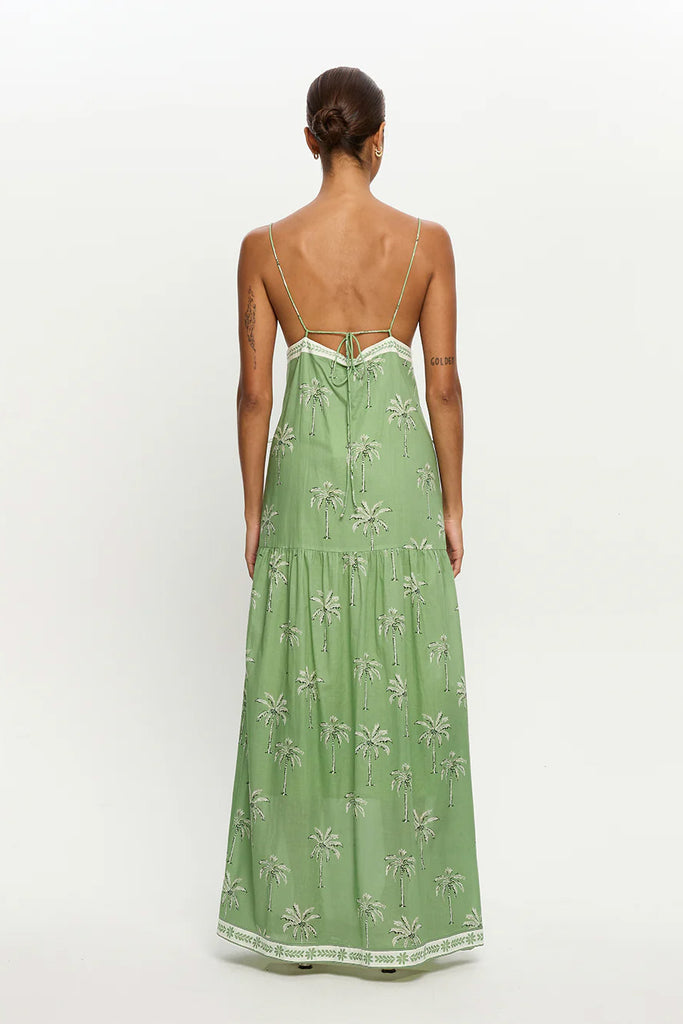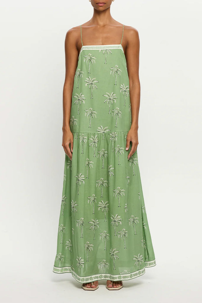 Kaelia is delicate ivory palms scattered across a soft green base. The Kaelia Strappy Maxi Dress is a relaxed silhouette featuring a straight neckline and fine shoulder straps, finished with a contrast border at the neckline and hem. Designed with a dropped waist and removable tie for versatile styling, it drapes softly through the body, balancing ease with refined detail. Style with slides relaxed afternoons, or elevate with heels for balmy evenings.