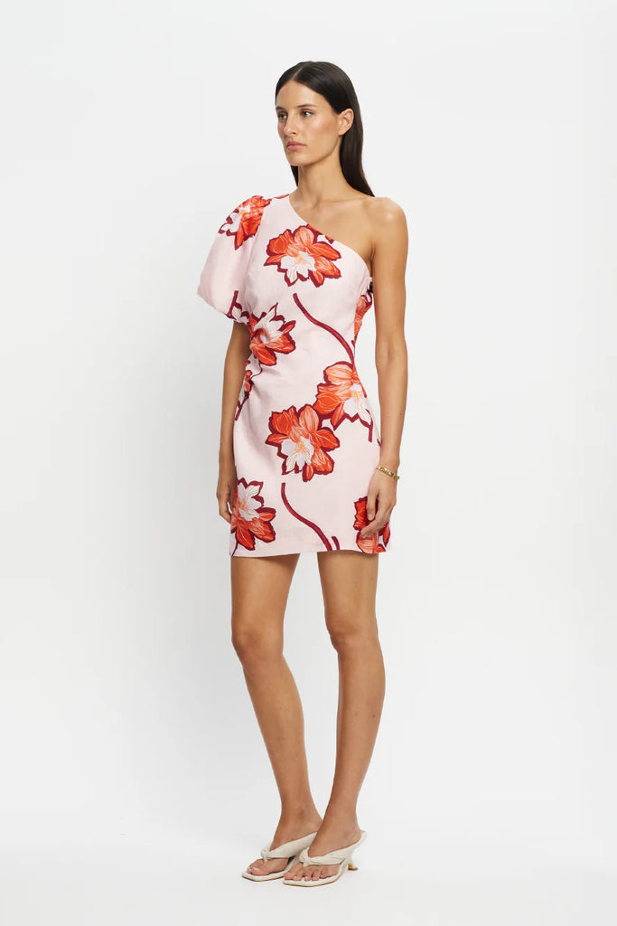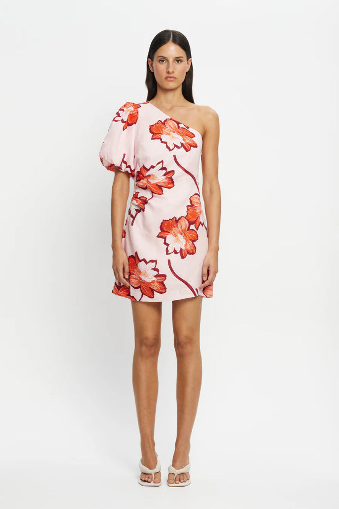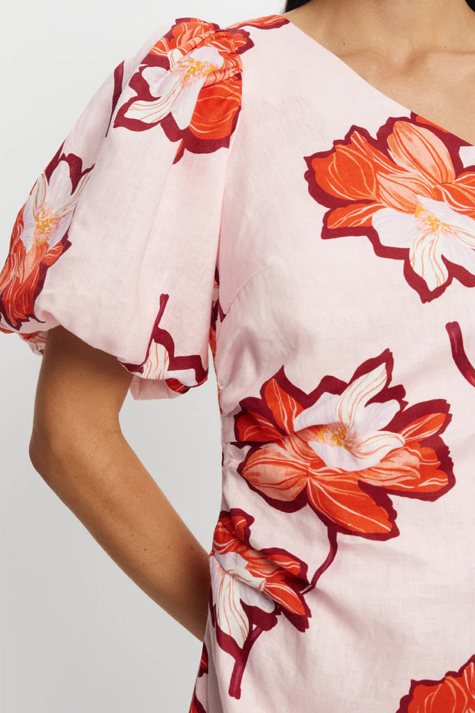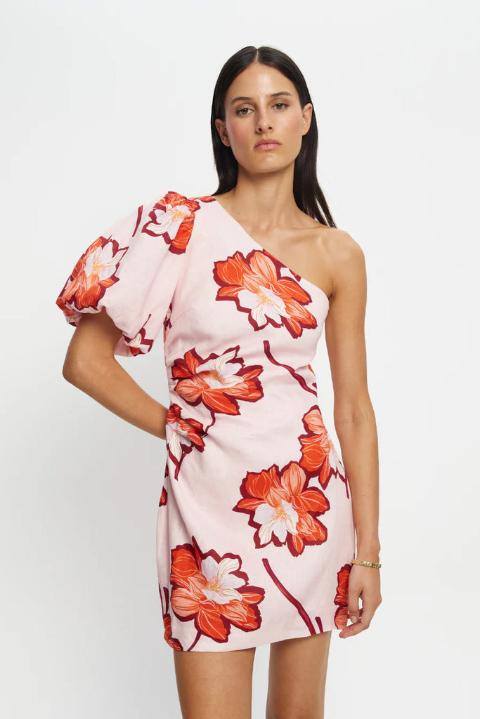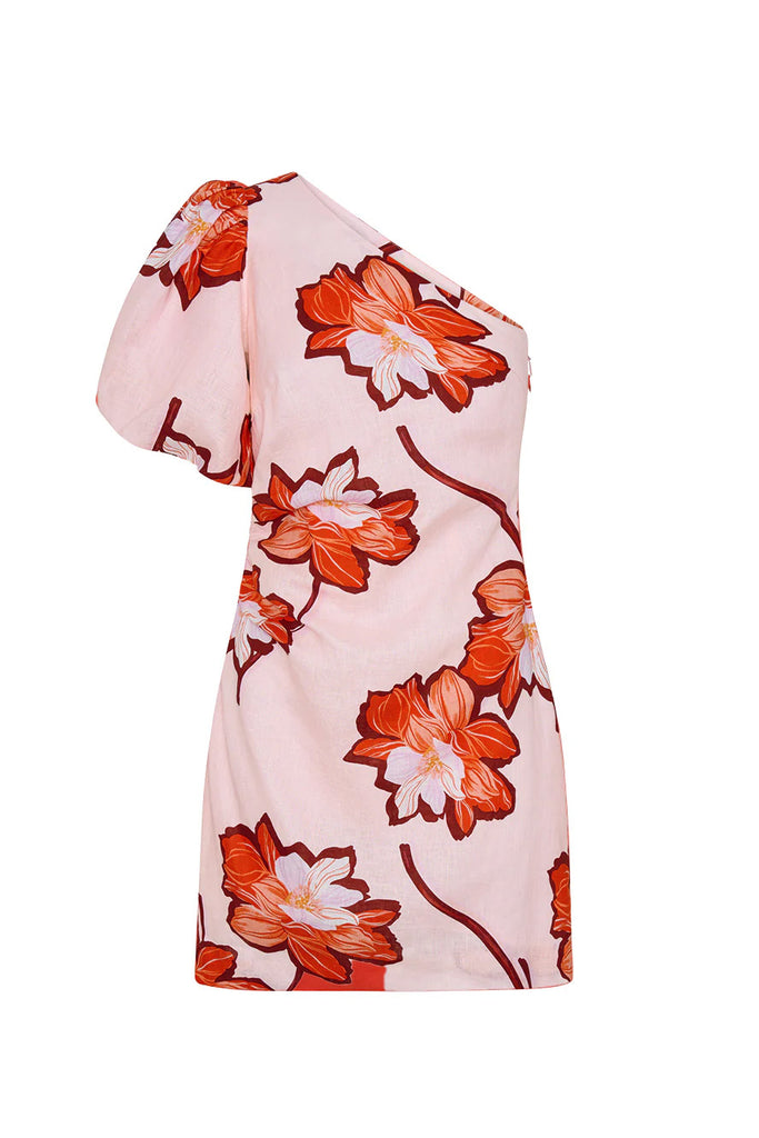 The Lani One Shoulder Mini Dress is crafted in a premium European Flax™ linen. Lani is a floral print featuring hibiscus-inspired blooms in vivid shades of orange and red on a soft pink base. The Lani One Shoulder Mini Dress is a statement silhouette featuring an asymmetric neckline, a softly gathered bubble sleeve and refined tuck detailing at the waist. Style with sandals for relaxed elegance or heels for an elevated finish.