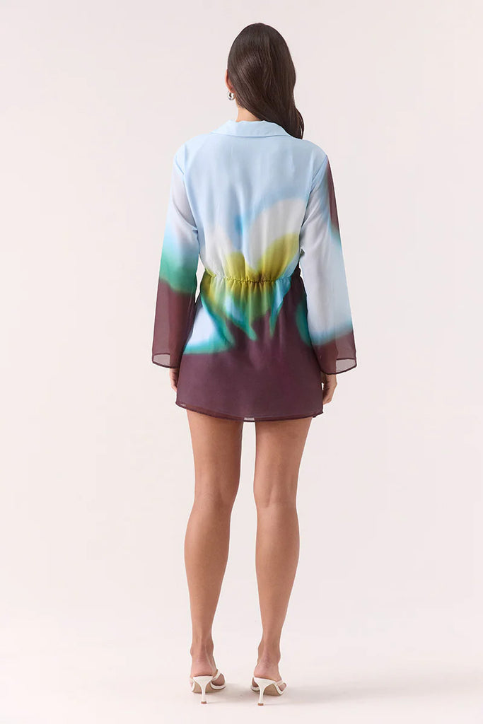 Elevate your wardrobe with this expertly crafted shirt dress, featuring an exclusive in-house print in a sophisticated azure palette. Crafted from luxurious chiffon, this piece showcases a relaxed silhouette with a subtle dropped shoulder for effortless elegance.