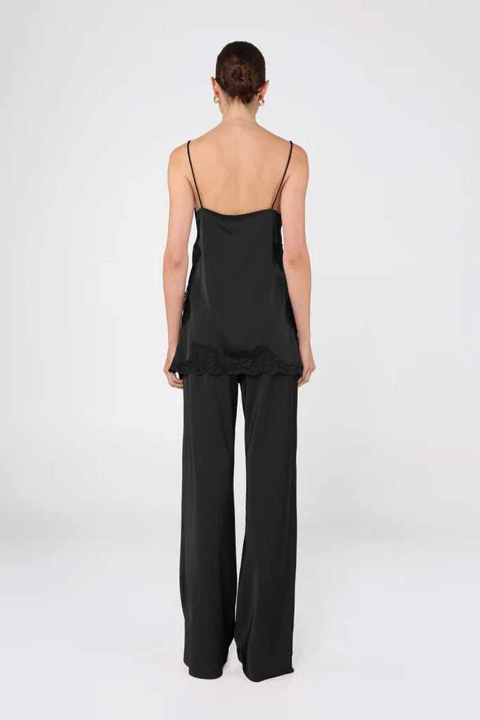 The Mela pant delivers effortless elegance with its soft, silky fabric and flattering high-waisted slim fit. Designed with an internal elasticated waist for all-day comfort and finished with a subtle fabric bias cut for refined movement, these black pants transition seamlessly from day to evening. Pair with the coordinating Mela lace top to complete a sophisticated ensemble.