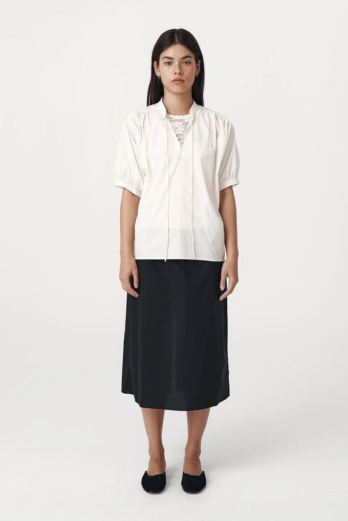 A relaxed organic cotton blouse featuring a mandarin collar with a soft tie neckline and voluminous sleeves gathered at the cuffs. Easy and refined, it brings an understated shape designed for everyday wear.
