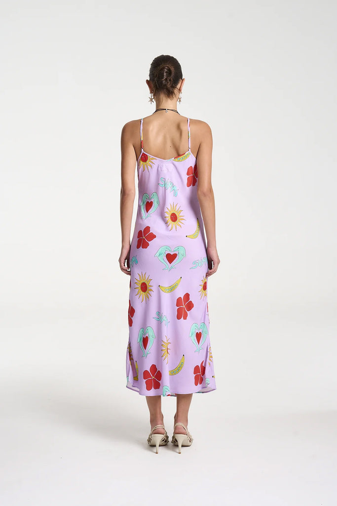 The Siren Midi Dress showcasing the hand-painted Troppo Motifs on a lilac base is a classic, lightweight and flattering midi dress with a v-neck-line and adjustable straps.