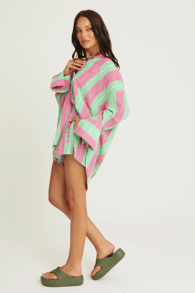 The Don Julio Shirt in green and pink is sunshine, cocktails and carefree energy wrapped into one mega-cute oversized button-up. Designed in juicy stripes, she's made from lightweight crinkle cotton that moves effortlessly and feels breezy from brunch to beach to bar.