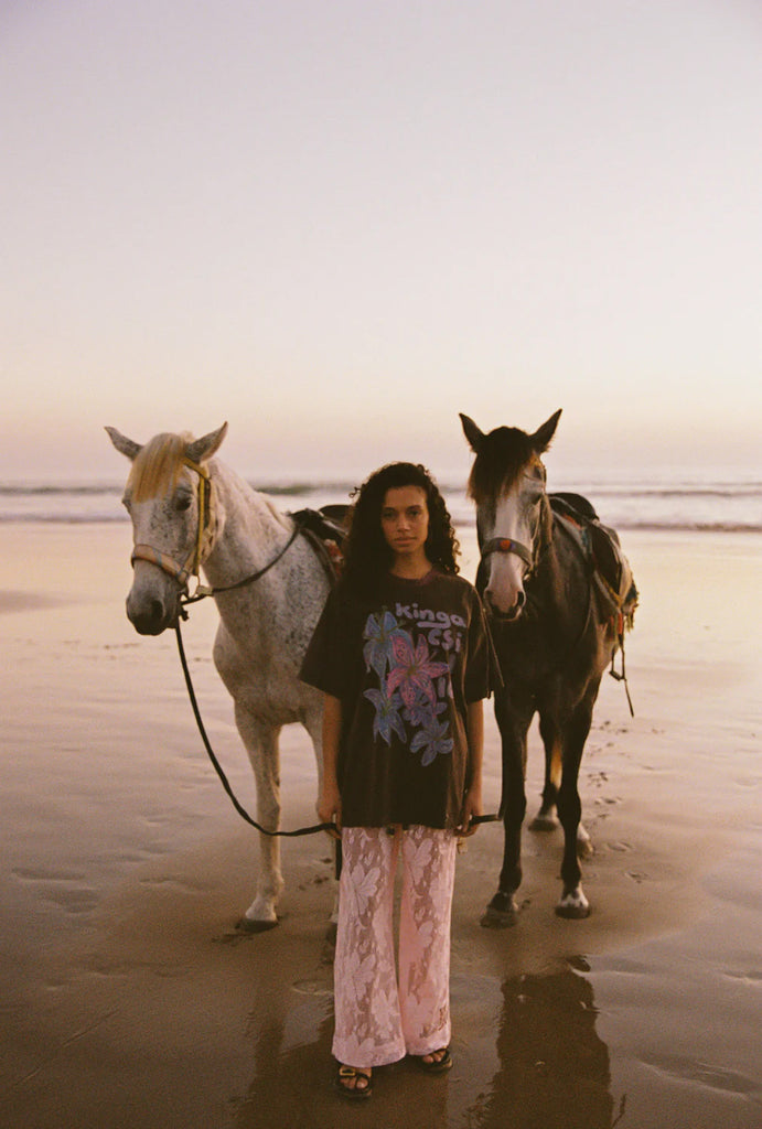 The Nova Lace Shyla Pant is a relaxed, statement piece that balances soft texture with an easy, modern silhouette. Cut in a wide-leg shape, the pant sits comfortably at the waist and falls loosely through the leg, creating fluid movement with every step.