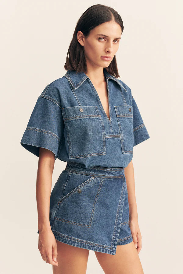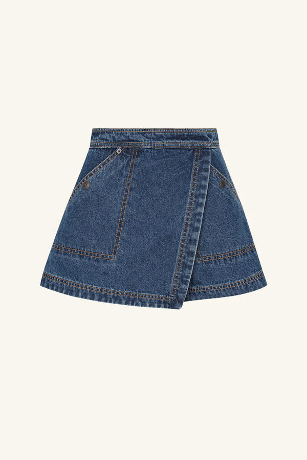 High waist asymmetric wrap front skort in a washed indigo denim.