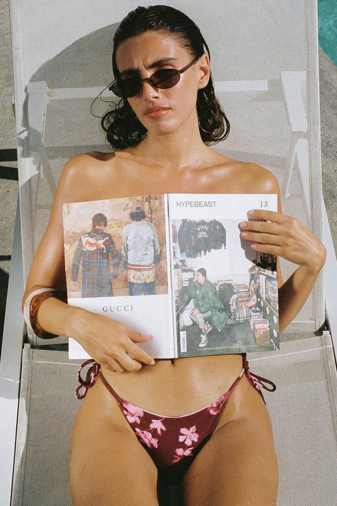 Switch it up with the Full Bloom Reversible String Bikini Bottom in Pomegranate. Designed with a cheeky fit and adjustable side ties, this women's swimwear offers two styles in one, featuring a bold floral side and a clean alternate side for variety. The smooth nylon blend construction offers stretch and a snug, comfy feel, while the fully lined finish keeps everything in place. Easy to style, quick to dry, and made for endless summer rotation, this one seamlessly pairs with the matching string bikini top.