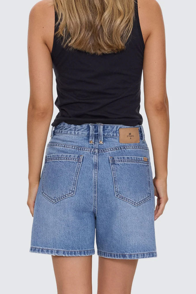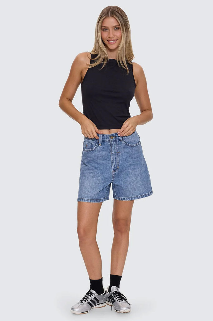 Introducing the Koko Short in Dark Dust Blue, an instant wardrobe classic to add to your denim collection. Perfectly loose and relaxed in a timeless vintage wash, it features a flattering high-rise cut with roomy legs for easy movement and multiple pockets. Made from premium cotton denim for durability that endures seasons and trends.
