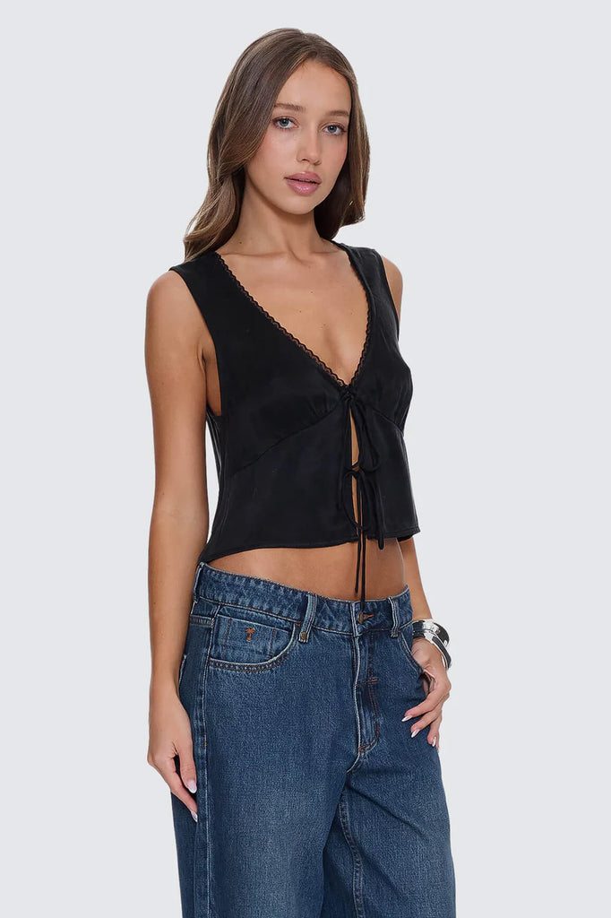 Turn up the sexy, after-dark energy with the Saige Tie Front Top in Black. Soft, fluid, and cut to flirt, this V-neck top is made from a luxe cupro-rayon blend designed to drape like a dream. The tie-up front lets you wear it your way, while delicate lace trim adds the subtle Thrills edge.