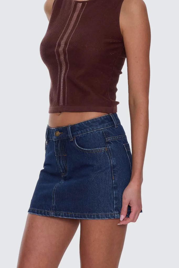 Add a fresh, versatile appeal to your streetwear with the Sophie Skirt in Rinsed Ink. Crafted from heavy-duty, non-stretch cotton denim, this micro mini skirt is chic and comfy featuring a classic 5-pocket styling, a flattering low-rise fit and a secure zip-and-button closure. Available in a sleek, dark blue wash for a timeless look with a modern edge.