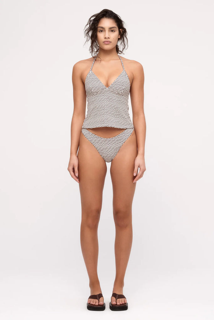 A curved waist bikini brief made from a buttery soft fabric in a spot print. Featuring self-fabric lining in a reversed colourway, it can be worn two ways. Designed to flatter the figure, it elongates the leg and creates shape through the hip.