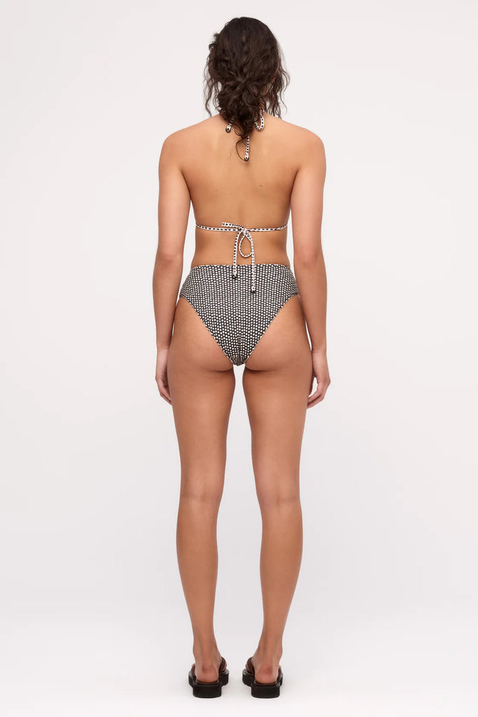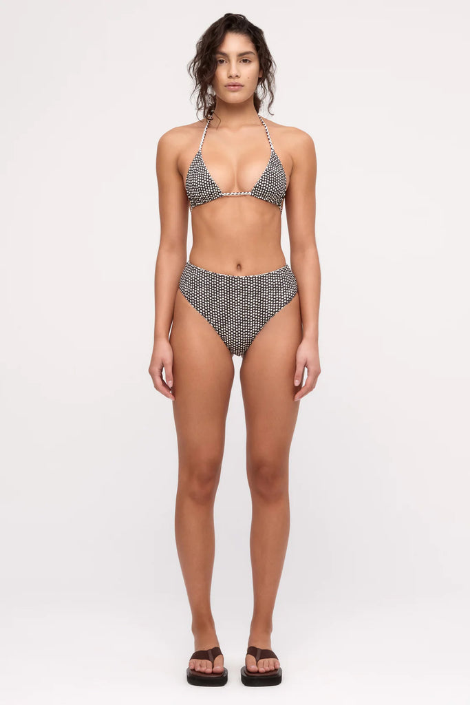 A skimpy triangle silhouette made from a smooth, buttery fabric. Featuring a spot print with self fabric lining in a reversed colourway, it can be worn on either side. Finished with adjustable halter ties and branded toggle ends for a classic, customisable fit.